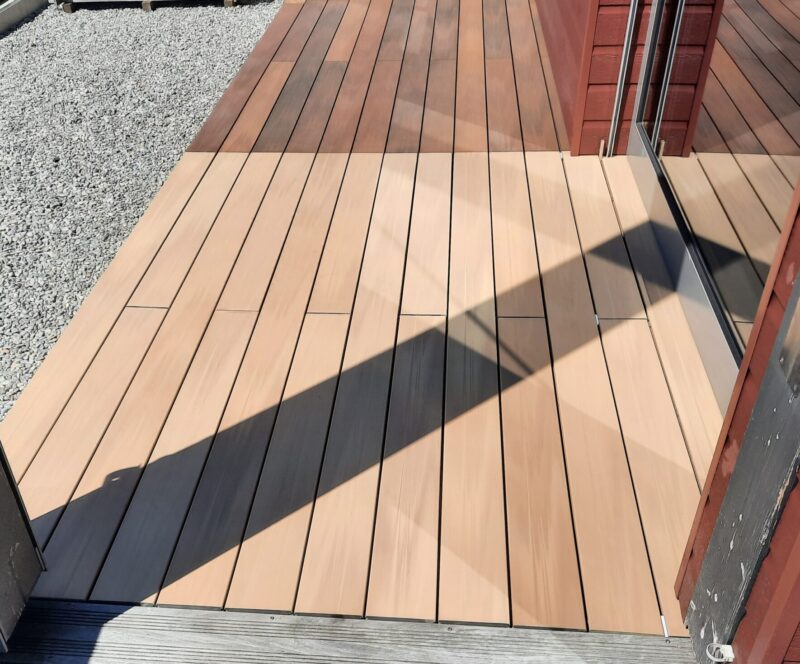 Auf diesem Bild, präsentiert von Artibois SA in Alle/Ju, wird der Unterschied zwischen Ipé, einem warmen, tiefen Braunton, und Eiche hell, einem freundlichen, natürlichen Farbton, besonders deutlich.